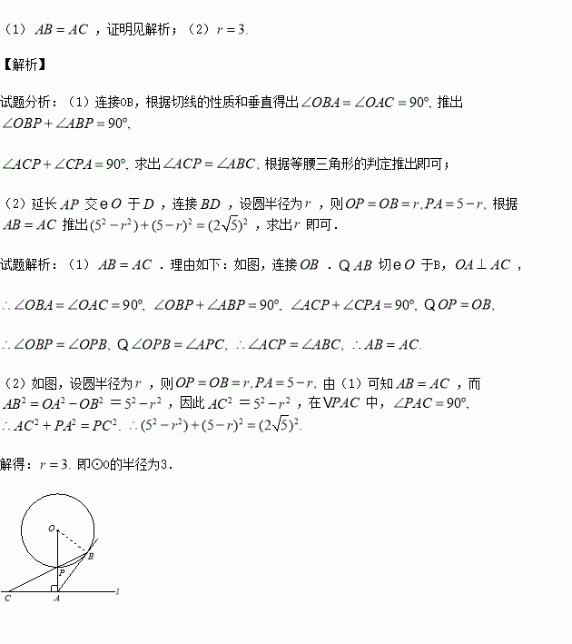 如图,直线l与⊙O相离,OA⊥l于点A,交⊙O于点P,OA=5.AB与⊙O相切于点B,BP的延长线交直线l于点C.