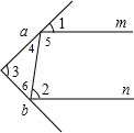 (3)当∠3=90°时,根据三角形内角和定理得∠4+∠6=90°,则2∠4+2∠6=180°,利用平角的定义得到∠2+∠5=180°,然后根据平行线的判定得到m∥n;