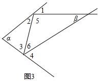 ∴∠β=180°-∠5-∠6=2(∠2+∠3)-180°=2(180°-∠α)-180°=180°-2∠α,