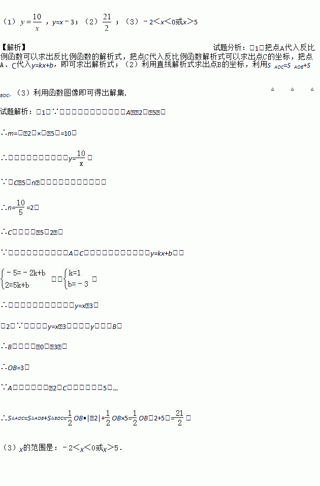 如图,一次函数的图象与反比例函数的图象交于点A﹙﹣2,﹣5﹚,C﹙5,n),交y轴于点B,交x轴于点D