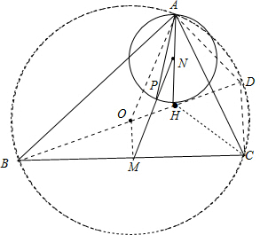 分析 先作△ABC的外接圆,连接BO并延长交⊙O于点D,连接OA、OM、CD、AD、CH,∴CD⊥BC,AD⊥AB,由点H是△ABC的垂心,易得四边形AHCD是平行四边形,由中位线及外接圆圆心易证四边形AOMN是平行四边形,可得∠OAB=∠CAH,可得出∠OAP+∠OAB=∠PAN+∠CAH,即可求出∠PAB=∠PAC.