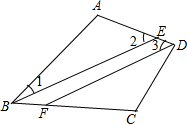 分析 根据角平分线的性质可得∠1=$\frac{1}{2}∠ABC$,∠3=$\frac{1}{2}$∠ADC,根据四边形内角和为360°可得∠1+∠3+∠A=180°,再根据三角形内角和可得∠A+∠1+∠2=180°,进而可得∠2=∠3,根据同位角相等,两直线平行可得FD∥BE.