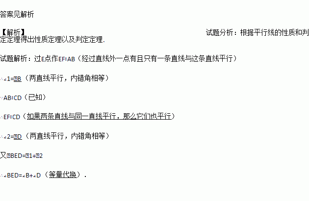 完成正确的证明:如图,已知AB∥CD,求证:∠BED=∠B+∠D