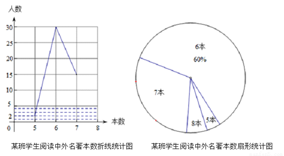 为响应“书香校园”号召,重庆一中在九年级学生中随机抽取某班学生对2016年全年阅读中外名著的情况进行调查,整理调查结果发现,每名学生阅读中外名著的本数,最少的有5本,最多的有8本,并根据调查结果绘制了如图所示的不完整的折线统计图和扇形统计图.