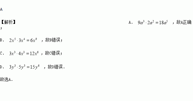 A. 9a3·2 a2=18 a5 B. 2 x5·3 x4=5 x9