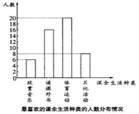 某中学为了解学生的课余生活情况,学校决定围绕“在欣赏音乐、读课外书、体育运动、其他活动中,你最喜欢的课余生活种类是什么?(只写一类)”的问题,在全校范围内随机抽取部分学生进行问卷调查,并将调查问卷适当整理后绘制成如图所示的不完整的条形统计图,其中最喜欢欣赏音乐的学生占被抽取人数的12%,请你根据以上信息解答下列问题: