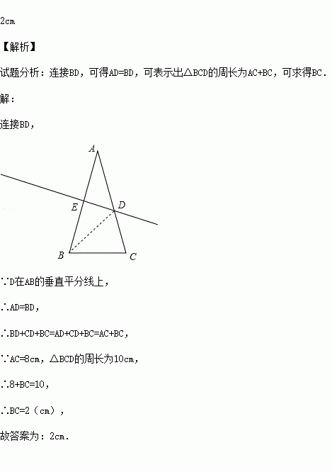 (2015秋•衡阳县期末)在等腰三角形ABC中,AB=AC=8cm,腰AB的垂直平分线交另一腰AC于D,若△BCD的周长为10cm,则底边BC的长为 .