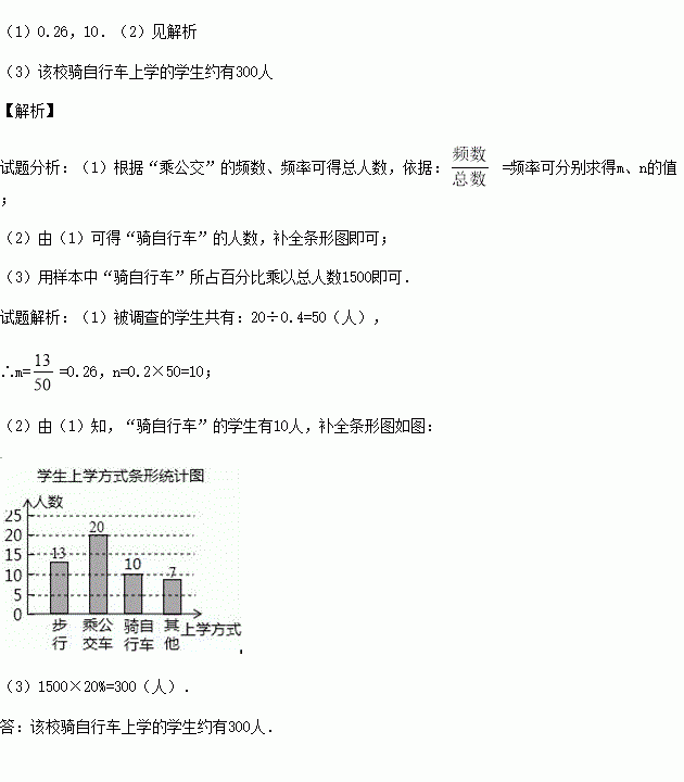 (3)如果该校共有1500名学生,请你估计该校骑自行车上学的学生有多少名?