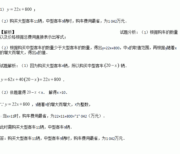 某汽车运输公司根据实际需要计划购买大、中型两种客车共20辆,已知大型客车每辆62万元,中型客车每辆40万元,设购买大型客车x(辆),购车总费用为y(万元).