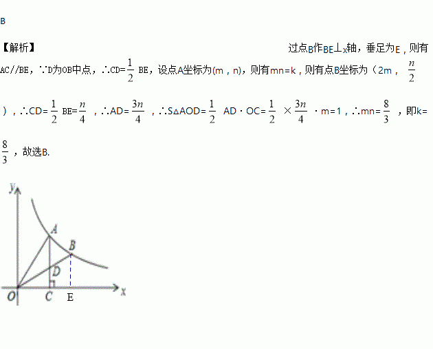上的两点,过A点作AC⊥x轴,交OB于D点,垂足为 C.若△ADO的面积为1,D为OB的中点,则k的值为( )