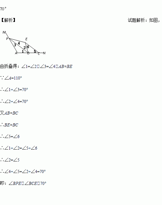 如图,∠A=110°,在边AN上取B,C,使AB=BC.点P为边AM上一点,将△APB沿PB折叠,使点A落在角内点E处,连接CE,则∠BPE+∠BCE=__________°