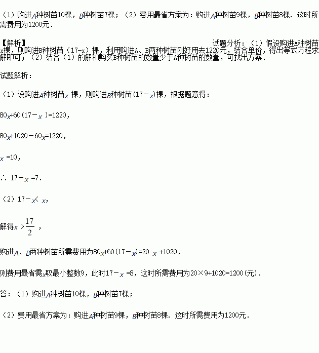 在植树节到来之际,某小区计划购进A、B两种树苗共17棵,已知A种树苗每棵80元,B种树苗每棵60元.