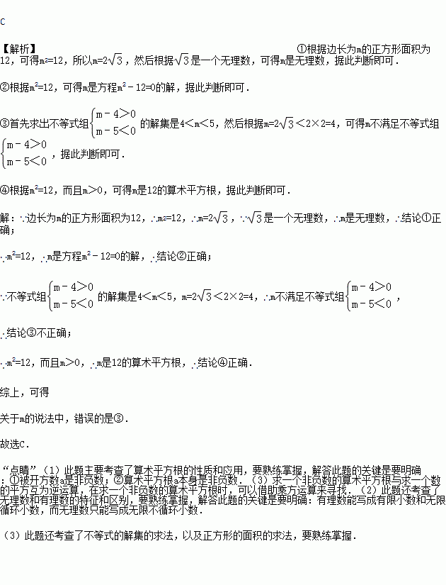 已知边长为m的正方形面积为12,则下列关于m的说法中,错误的是( )