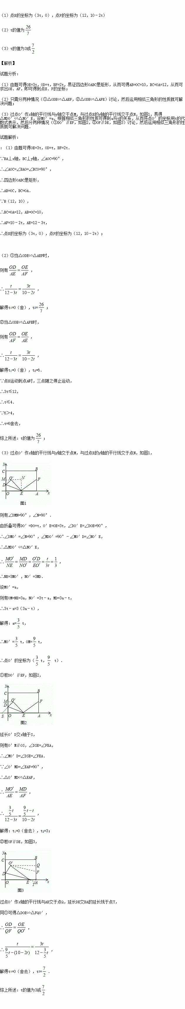 如图,在平面直角坐标系中,点B(12,10),过点B作x轴的垂线,垂足为A.作y轴的垂线,垂足为C.点D从O出发,沿y轴正方向以每秒1个单位长度运动;点E从O出发,沿x轴正方向以每秒3个单位长度运动;点F从B出发,沿BA方向以每秒2个单位长度运动.当点E运动到点A时,三点随之停止运动.运动过程中△ODE关于直线DE的对称图形是△O′DE,设运动时间为t.