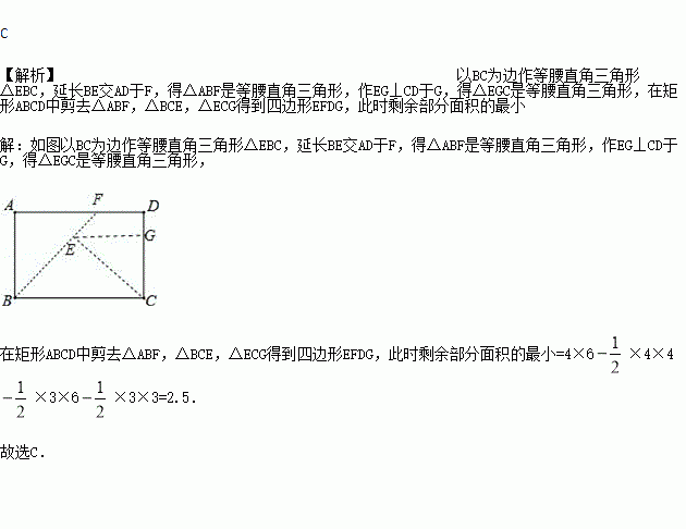 如图,矩形纸片ABCD中,AB=4,BC=6.将该矩形纸片剪去3个等腰直角三角形,所有剪法中剩余部分面积的最小值是( )