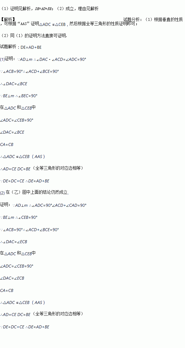 (1)在图(甲)中,求证:△ACD≌△CBE.你能探索出线段AD、BE、DE之间的关系吗?