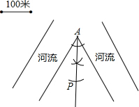 有两条河流交汇形成一个三角地带,此地域风景宜人,土壤肥沃,小猪想择此地建造房屋P,他想到两条河流距离要相等,并且与两河交汇点的距离需200米。小猪不知道该怎么选择,你能帮助他吗?