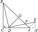 分析 过点E作EH⊥AC,垂足为H,连接AE.先依据AAS证明△BCD≌△DHE,从而得到BC=DH,CD=EH=2$\sqrt{2}$,由等腰直角三角形的性质可知BC=CA,从而可证明AH=EH=2$\sqrt{2}$,由勾股定理可知AE=4.在△EFA中由勾股定理可求得AF=3,由∠BDF=∠FAE,∠BFD=∠EFA可知△BDF∽△EFA,设DF=x,则BD=DE=x+5由相似三角形的性质可知:$\frac{x+5}{x}=\frac{4}{3}$.解得:x=15.故此DF=15,BD=20,从而可求得BG=$\frac{4}{5}$BD=16,DG=$\frac{3}{5}BD$=12,最后依据三角形的面积公式求解即可.
