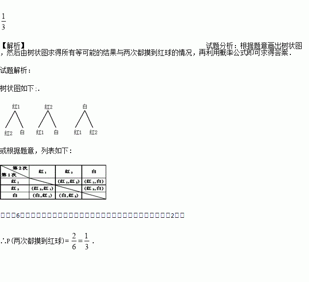 在一个不透明的袋子中,装有2个红球和1个白球,这些球除了颜色外都相同.如果第一次随机摸出一个小球(不放回),充分搅匀后,第二次再从剩余的两球中随机摸出一个小球,求两次都摸到红球的概率.(用树状图或列表法求解)