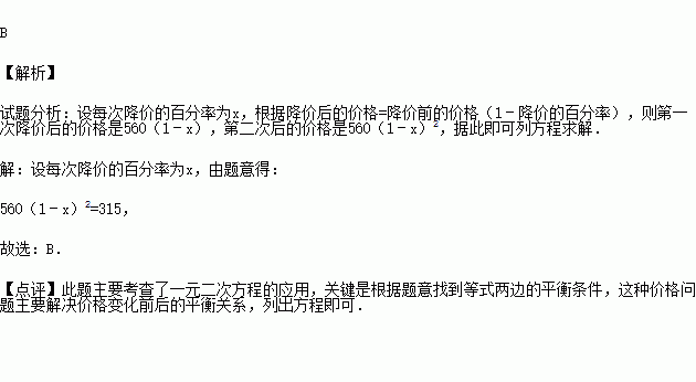 某种品牌运动服经过两次降价,每件零售价由560元降为315元,已知两次降价的百分率相同,求每次降价的百分率.设每次降价的百分率为x,下面所列的方程中正确的是( )