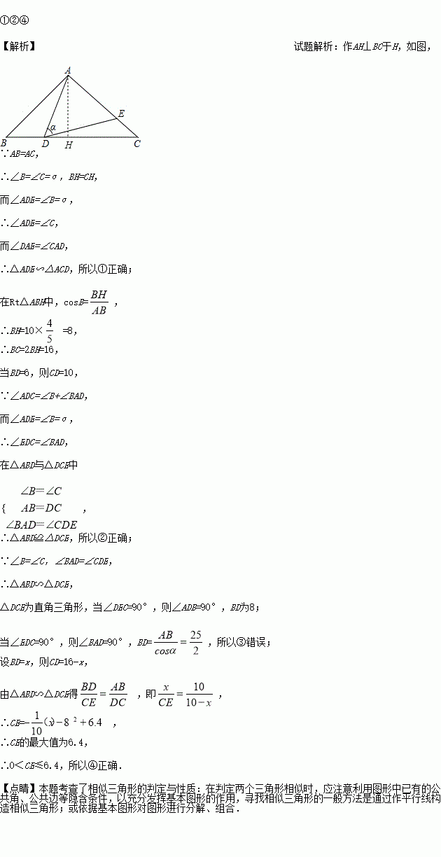 如图,在△ABC中,AB=AC=10,点D是边BC上一动点(不与B,C重合),∠ADE=∠B=α,DE交AC于点E,且cosα=
