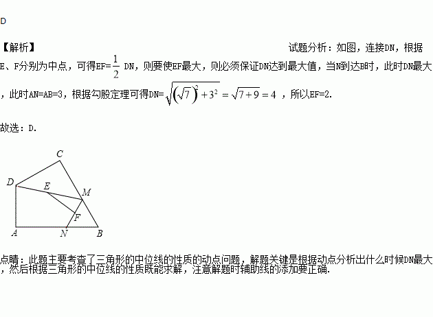 ,点M、N分别为线段BC、AB上的动点,点E、F分别为DM、MN的中点,则EF长度的最大值为( )