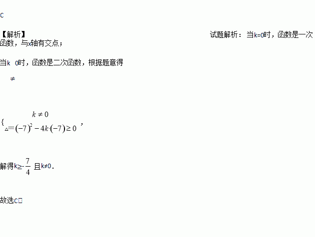 已知函数y=kx2-7x-7的图象与x轴有交点,则k的取值范围是( )