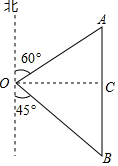 分析 作OC⊥AB于C,由已知可得△ABO中∠A=60°,∠B=45°且OA=80m,要求OB的长,可以先求出OC和BC的长.
