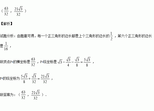 如图,以O(0,0)、A(2,0)为顶点作正△OAP1,以点P1和线段P1A的中点B为顶点作正△P1BP2,再以点P2和线段P2B的中点C为顶点作△P2CP3,…,如此继续下去,则第六个正三角形中,不在第五个正三角形上的顶点P6的坐标是 .