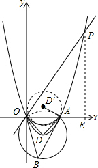 (3)设点P的坐标为(x,y),且x>0,y>0,当点P在抛物线y=$\frac{1}{4}$x2-2x上时根据点B是⊙D的优弧上的一点,∠ODA=90°可知∠OBA=$\frac{1}{2}$∠ADO=45°.再由∠POA:∠OBA=2:3得出∠POA=$\frac{2}{3}$∠OBA=30°.过点P作PE⊥x轴于点E,由tan∠POE=$\frac{EP}{OE}$可知$\frac{y}{x}$=tan30°,故y=$\frac{\sqrt{3}}{3}$x.再代入抛物线的解析式求出x的值,进而可得出结论.