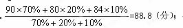 某校规定:学生期末数学总评成绩由三部分构成:卷面成绩、小组成绩、平日表现成绩(三部分所占比例如图),若张楠同学的三部分得分依次是92、80、84,则她这学期期末数学总评成绩是多少?