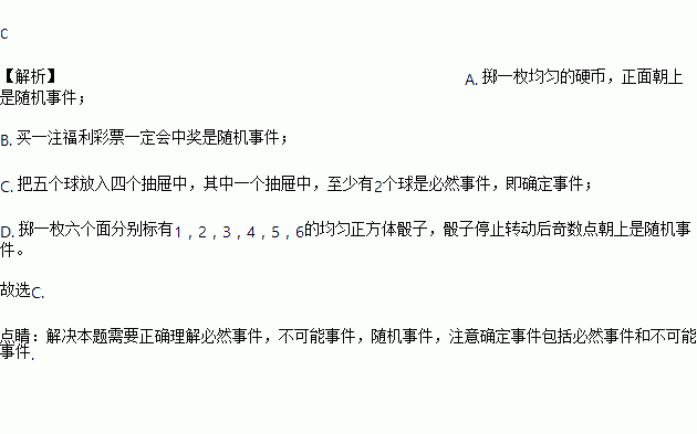 C. 把五个球放入四个抽屉中,其中一个抽屉中,至少有2个球