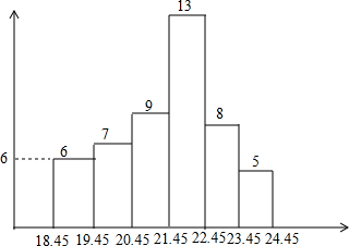 解答 解:最小值是:18.5,最大值是:24.4.则差是:24.4-18.5=5.9(吨).组距是1,则分成6组.