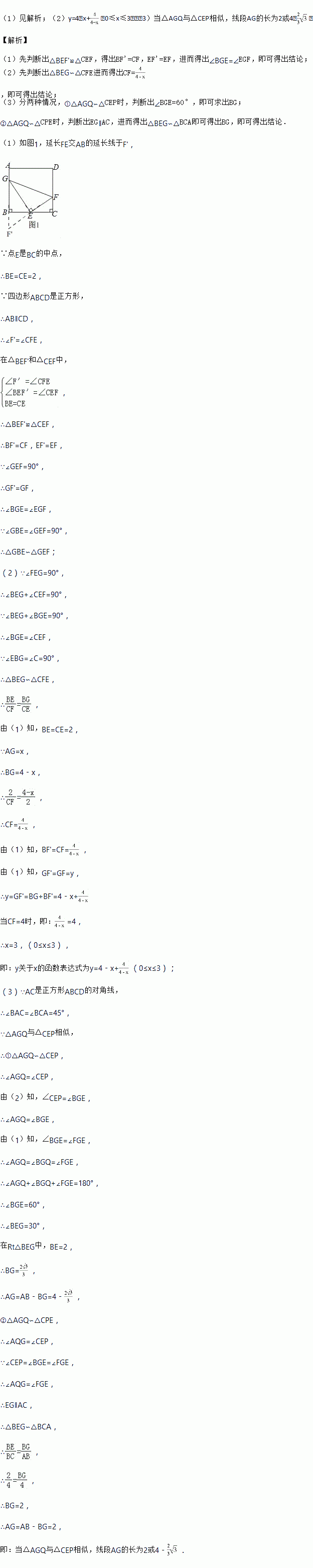 如图1,正方形ABCD的边长为4,把三角板的直角顶点放置BC中点E处,三角板绕点E旋转,三角板的两边分别交边AB、CD于点G、F.
