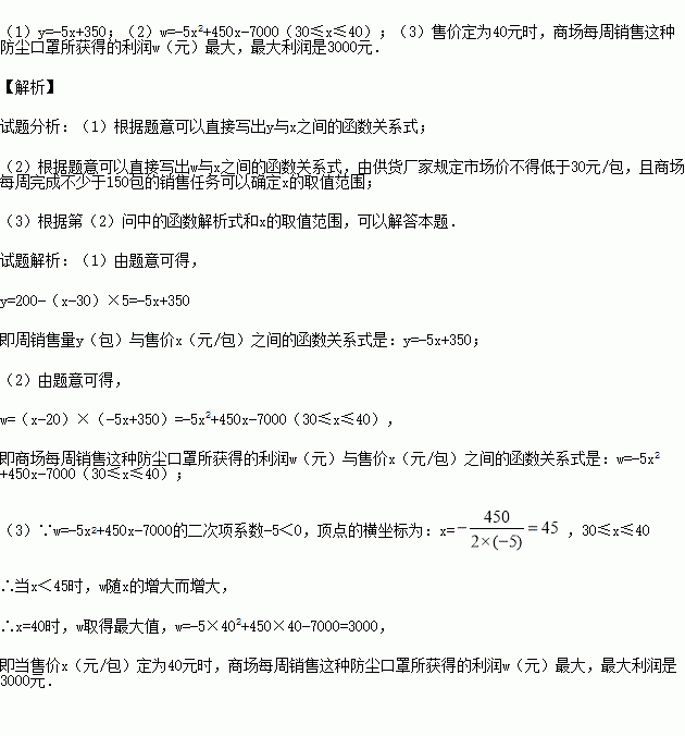 (3)当售价x(元/包)定为多少元时,商场每周销售这种防尘口罩所获得的利润w(元)最大?最大利润是多少?