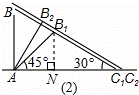(2)因水土流失,此时树AB沿太阳光线方向倒下,在倾倒过程中,树影长度发生了变化,假设太阳光线与地面夹角保持不变.求树的最大影长.(用图(2)解答)