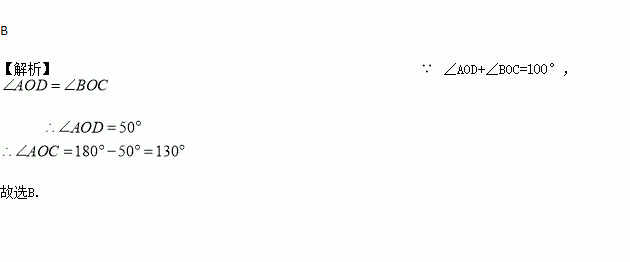如图所示,直线AB、CD相交于点O,且∠AOD+∠BOC=100°,则∠AOC是( ).