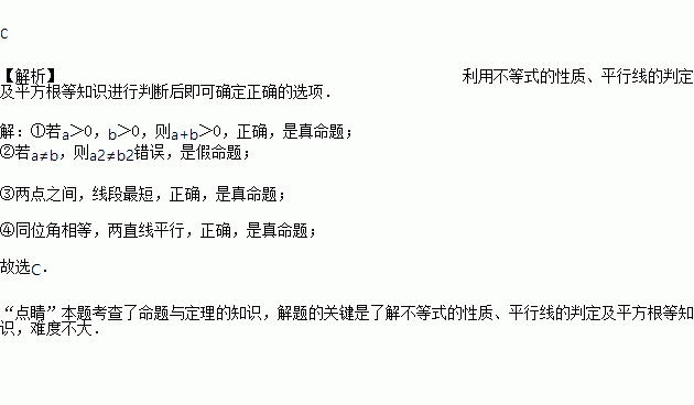 已知下列命题:①若a>0,b>0,则a+b>0;②若a≠b,则a2≠b2;③两点之间,线段最短;④同位角相等,两直线平行.其中真命题的个数是( )