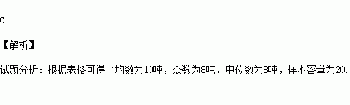 A.平均数是10(吨) B.众数是8(吨) C.中位数是10(吨) D.样本容量是20
