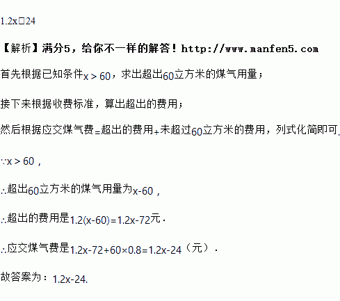 煤气费的收费标准为每月用气若不超过60m3,按每立方米0.8元收费;如果超过60m3,超过部分按每立方米1.2元收费.已知某住户某个月用煤气xm3(x>60),则该住户应交煤气费________元.