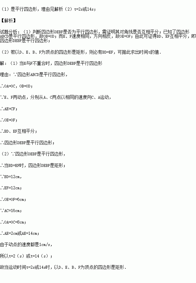 (2)若BD=12cm,AC=16cm,当运动时间t为何值时,以D、E、B、F为顶点的四边形是矩形?