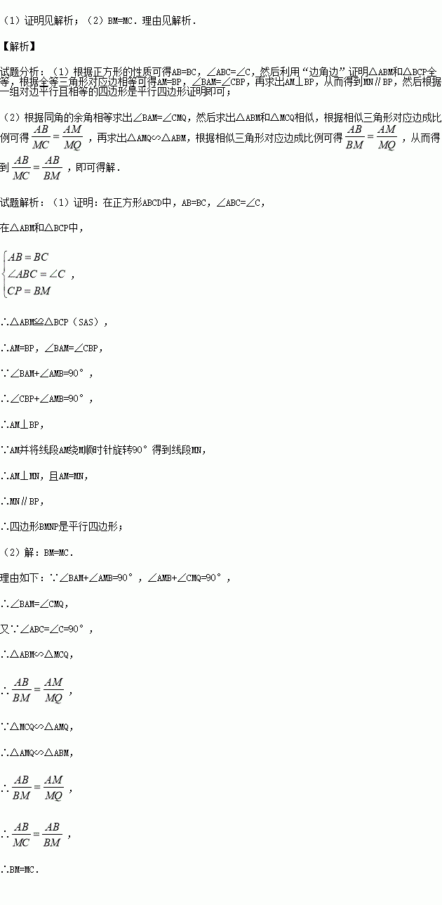 (2)线段MN与CD交于点Q,连接AQ,若△MCQ∽△AMQ,则BM与MC存在怎样的数量关系?请说明理由.