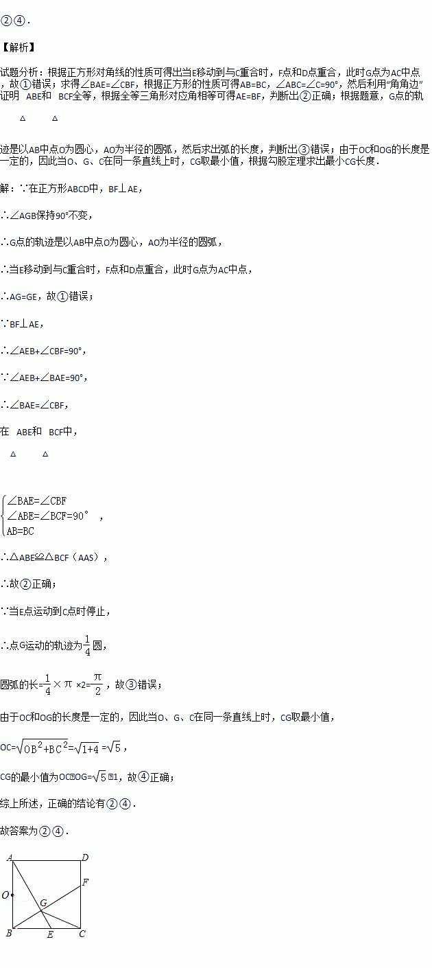如图,已知正方形ABCD的边长为2,E是边BC上的动点,BF⊥AE交CD于点F,垂足为G,连结CG.下列说法:①AG>GE;②AE=BF;③点G运动的路径长为π;④CG的最小值为