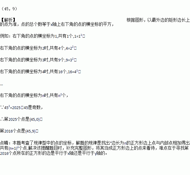 如图,在平面直接坐标系中,有若干个横坐标分别为整数的点,其顺序按图中(1,0)→(2,0)→(2,1)→(1,1)→(1,2)→(2,2)…根据这个规律,则第2016个点的坐标为_______.