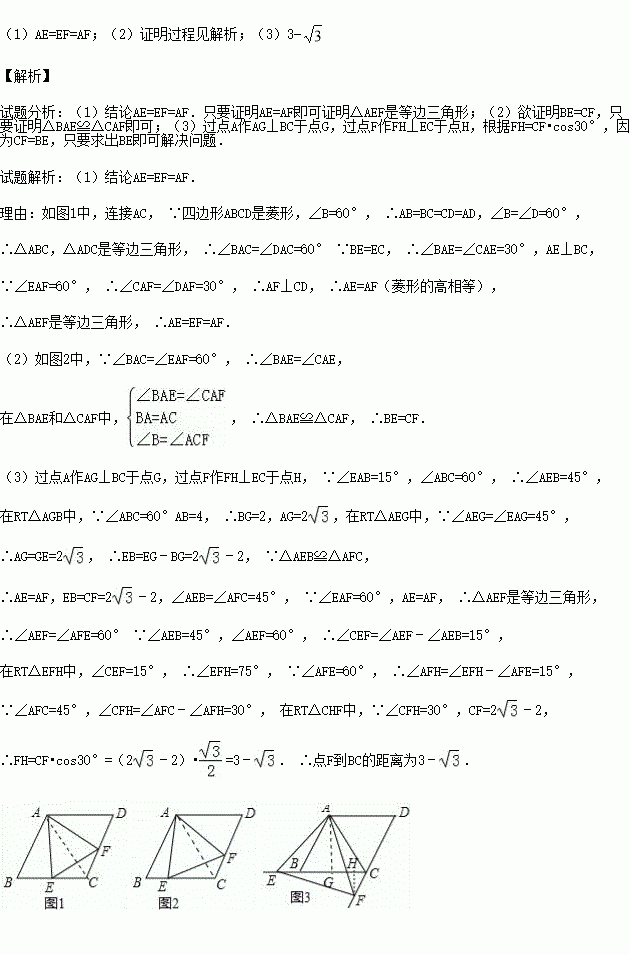 已知四边形ABCD是菱形,AB=4,∠ABC=60°,∠EAF的两边分别与射线CB,DC相交于点E,F,且∠EAF=60°.