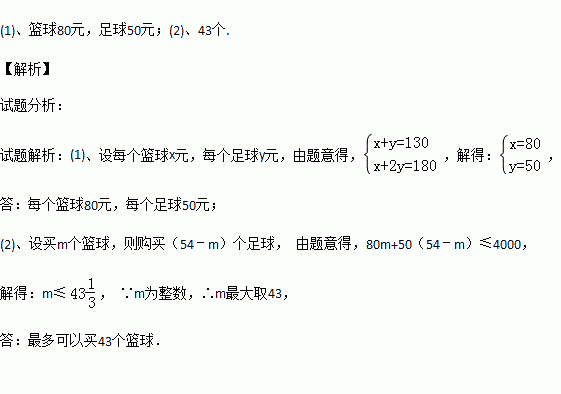 (2)如果某校计划购买这两种球共54个,总费用不超过4000元,问最多可买多少个篮球?