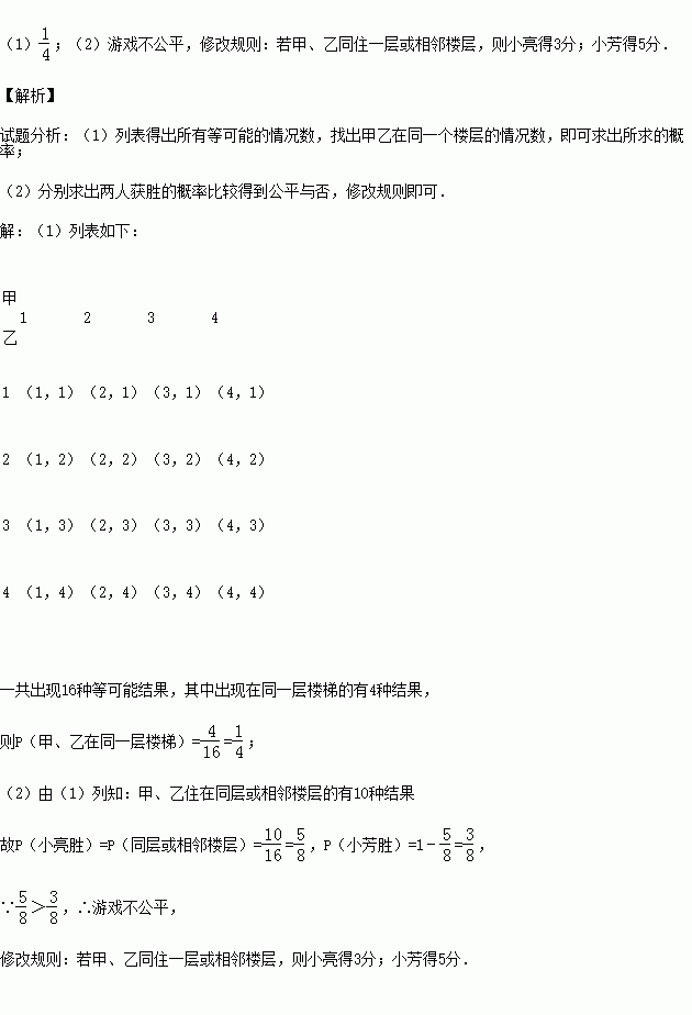 (2)小亮和小芳打赌说:“若甲、乙在同一层或相邻楼层出电梯,则小亮胜,否则小芳胜”.该游戏是否公平?若公平,说明理由;若不公平,请修改游戏规则,使游戏公平.
