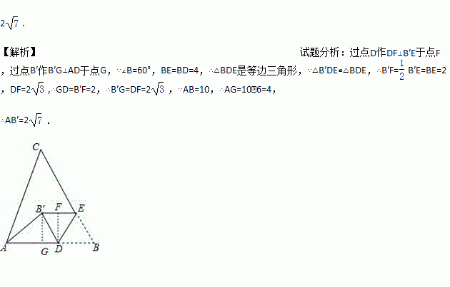 如图,在△ABC中,AB=10,∠B=60°,点D、E分别在AB、BC上,且BD=BE=4,将△BDE沿DE所在直线折叠得到△B′DE(点B′在四边形ADEC内),连接AB′,则AB′的长为______.