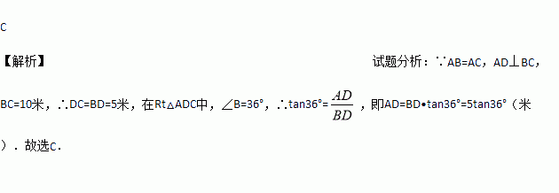 如图,厂房屋顶人字形(等腰三角形)钢架的跨度BC=10米,∠B=36°,则中柱AD(D为底边中点)的长是( )
