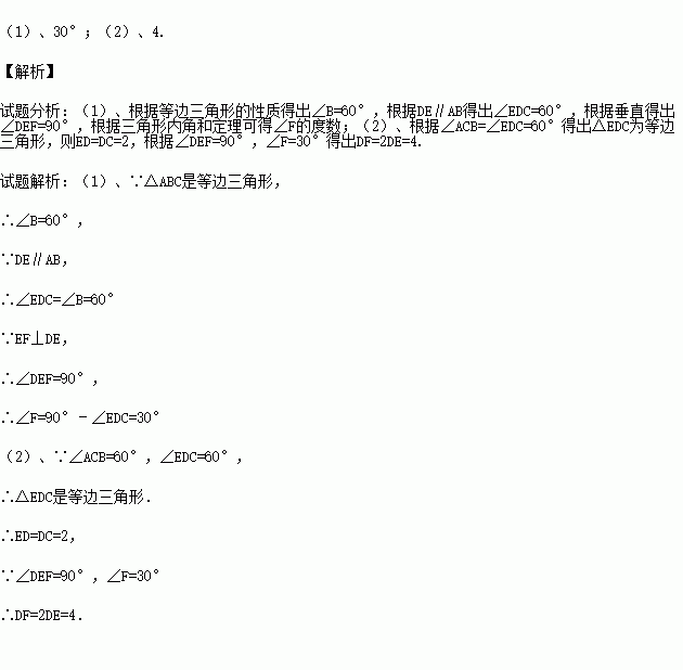 如图,在等边三角形ABC中,点D,E分别在边BC,AC上,DE∥AB,过点E作EF⊥DE,交BC的延长线于点F.